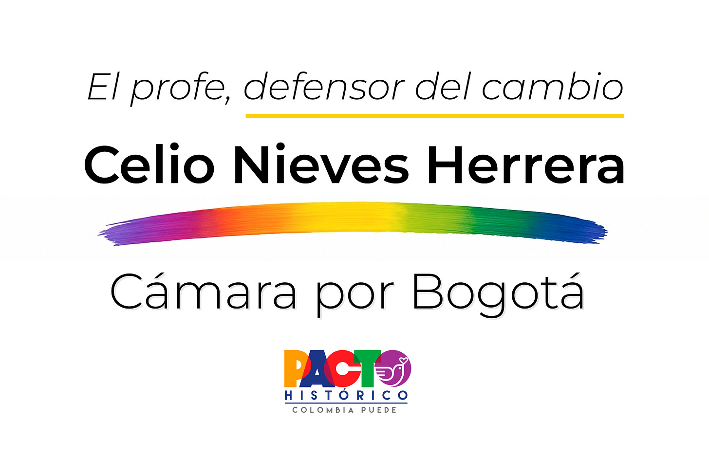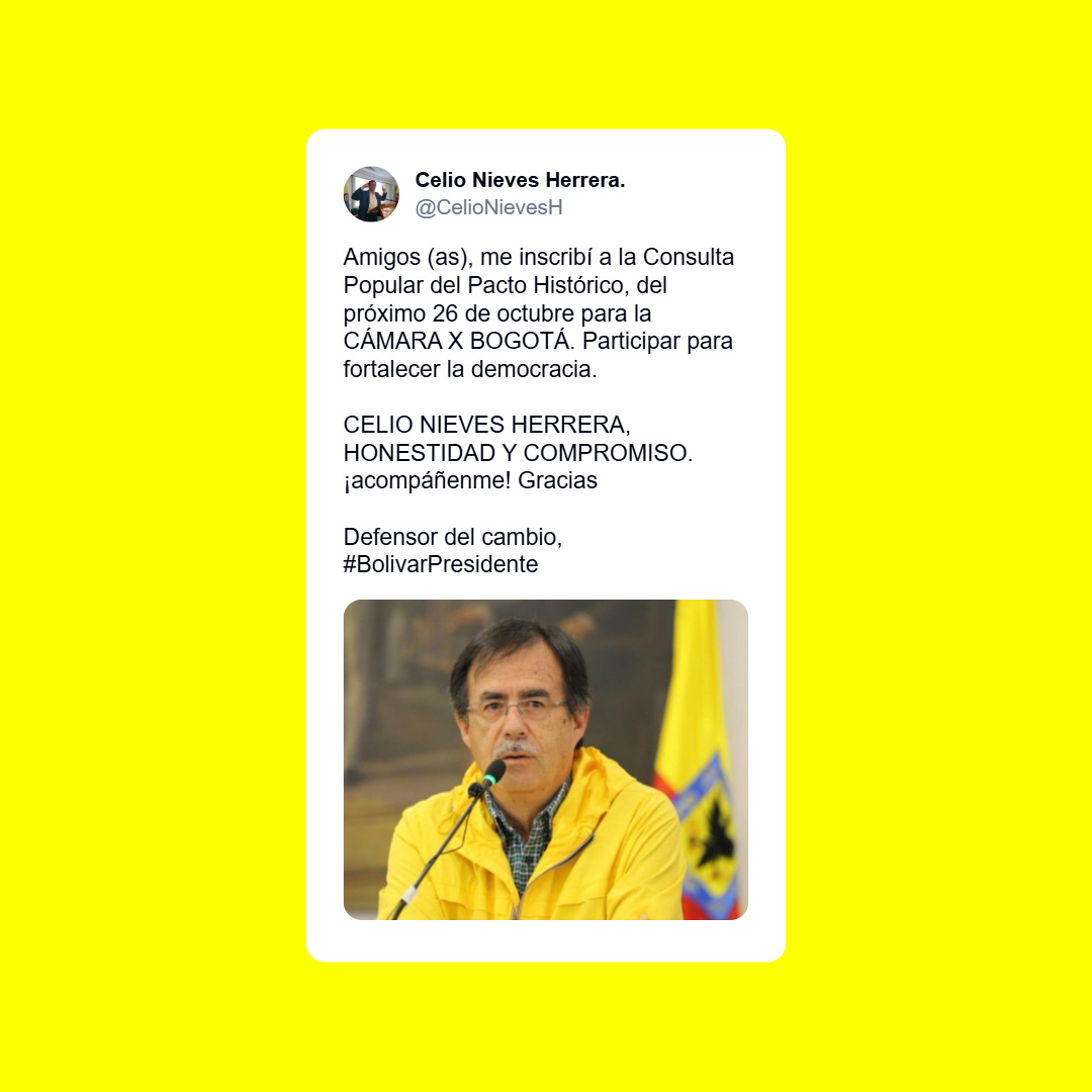 En correspondencia con lo anterior y siendo un militante más del Pacto Histórico y de las causas sociales que enarbolaremos en la búsqueda de consolidar el estado social de derecho y junto a otros importantes liderazgos pongo a consideración mi nombre CELIO NIEVES HERRERA para participar en la consulta popular para hacer parte de la lista a la CAMARA que por Bogotá representará con dignidad no solo al Pacto si no a las familias bogotanas más necesitadas. Iremos a la Cámara a defender los avances en política social, económica, ambiental del actual gobierno del cambio y profundizaremos en temas de la educación y los educadores, en la defensa de la naturaleza y en lograr más oportunidades bienestar para el pueblo Colombiano. Amigos, amigas, compañeros, compañeras: los y las invito a acompañarme en esta causa, ustedes me conocen y hemos estado juntos en esta lucha histórica por mejorar las condiciones de vida de los (as) Colombianos(as).